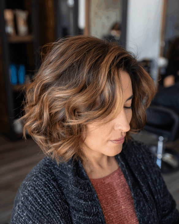 Here’s a fun and flattering take on the bob with lots of movement. The soft waves and warm honey highlights create dimension and a youthful glow.