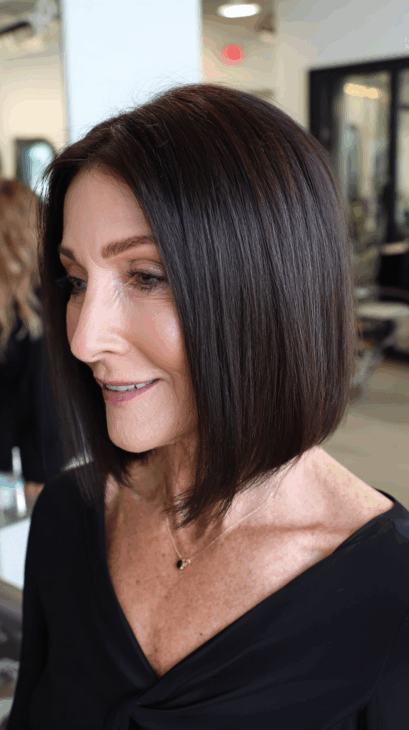This one’s a perfect example of a clean, structured bob. The lines are sharp but not harsh, and the warm brunette tone adds depth.