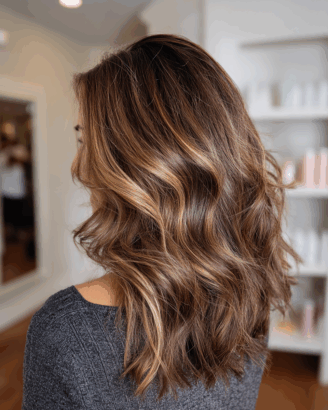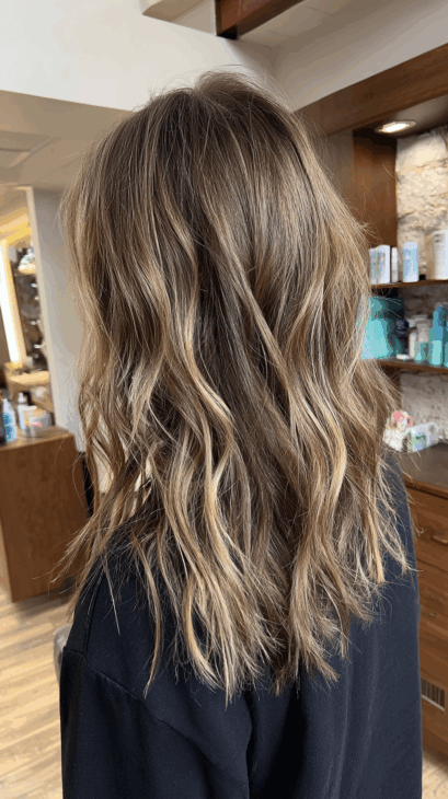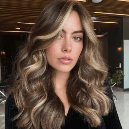 This look is all about texture and tone. The soft waves pair perfectly with warm blonde ribbons that pop against the brown base.