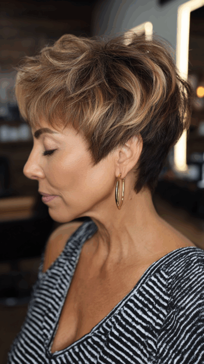 This short, layered pixie uses blonde highlights to add texture and lift through the crown. The combination of warm and cool tones makes the cut look dynamic and full of movement.