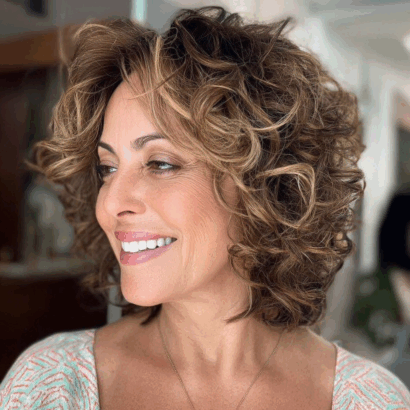 This curly bob is a fantastic choice for women over 40 who want something stylish yet easy to maintain. The layers add movement, while the subtle lowlights create depth, making the curls appear more defined.