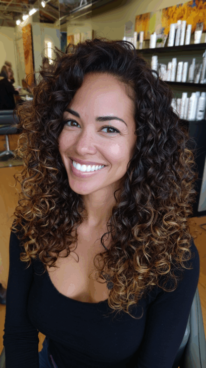If you’re looking for a style that blends curls with soft waves, this one’s perfect. The darker base with lighter balayage highlights adds depth and movement, making it ideal for those who want a touch of elegance.