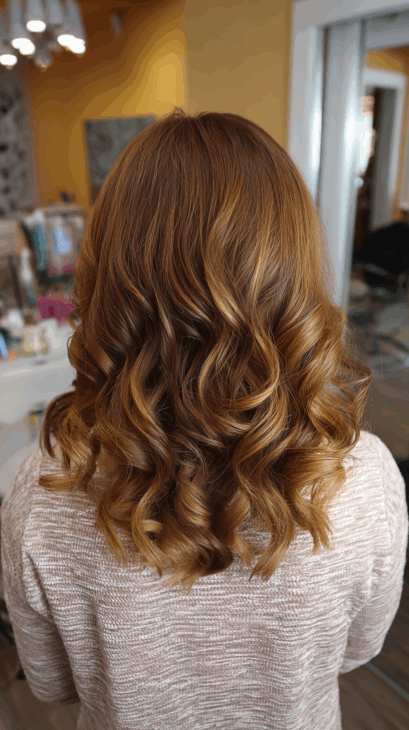These soft waves show off everything golden brown does best: depth, light, and natural movement. The highlights are placed perfectly to enhance each curl and layer.