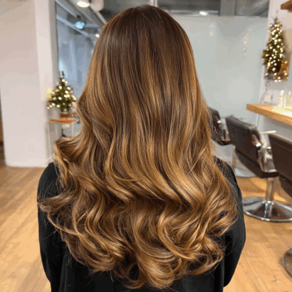 These soft, honey-touched curls bring so much movement and warmth to the hair. The balayage blends beautifully from root to tip, giving that natural sunlit effect.
