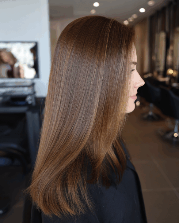 This silky, golden brown hair has the perfect balance of warmth and depth. The color catches the light in such a natural way, giving that fresh-from-the-salon glow.