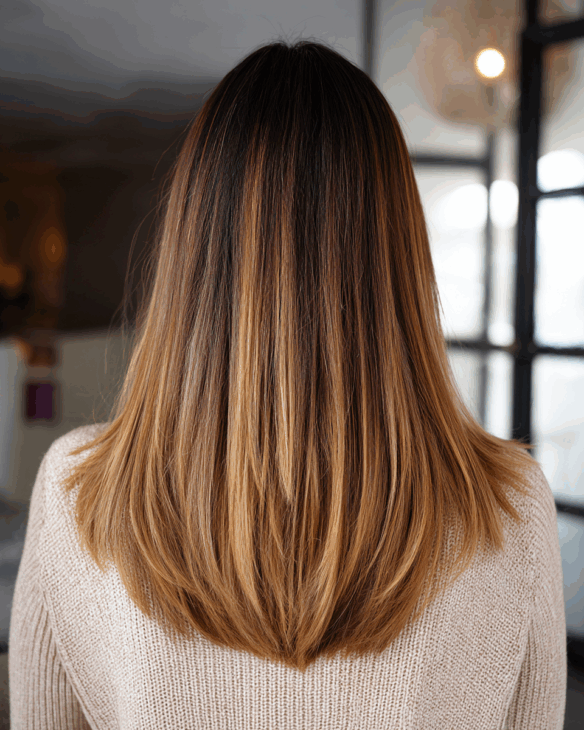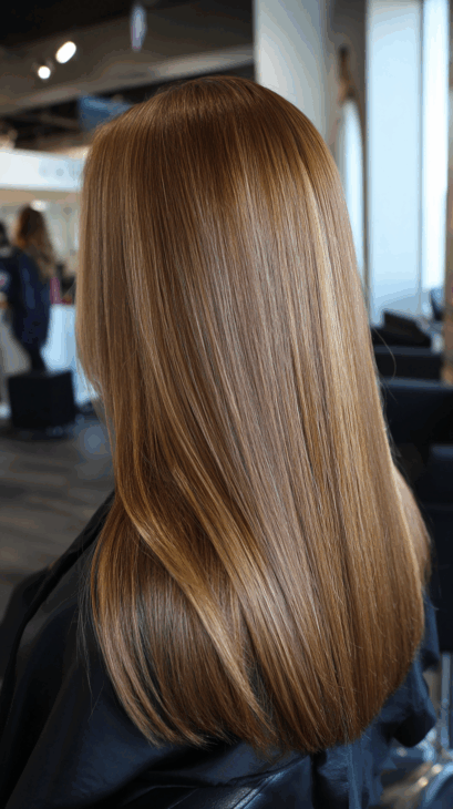 This sleek golden brown look is all about shine and smoothness. The layers add movement, while the subtle highlights create that natural, glossy finish.