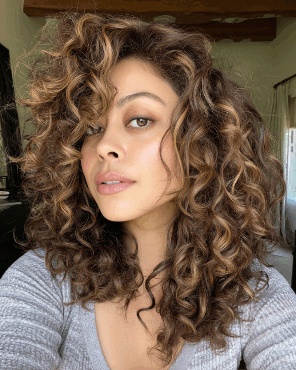 These curls are full of life and glow. The golden brown balayage enhances the shape of each curl, giving it definition and warmth.