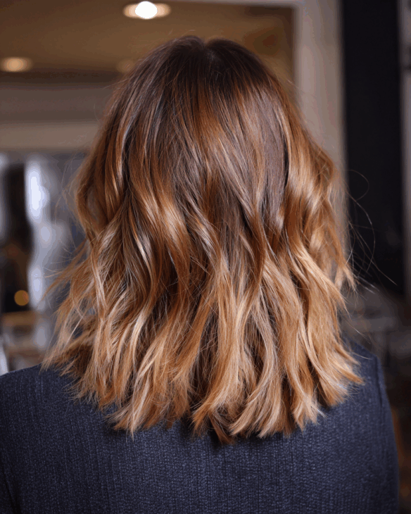 This textured lob features softly blended golden brown balayage for a lived-in finish. The waves bring out every highlight, making the hair look thicker and more dimensional.
