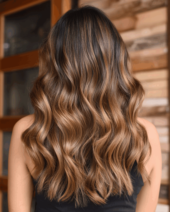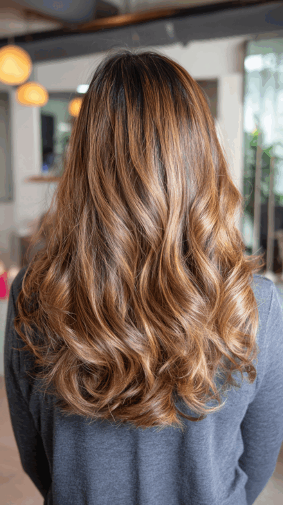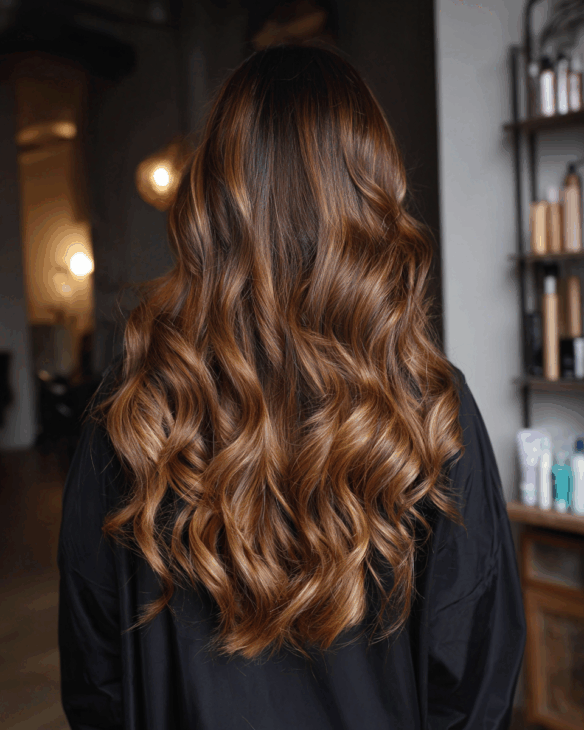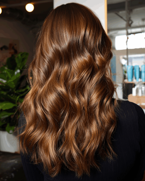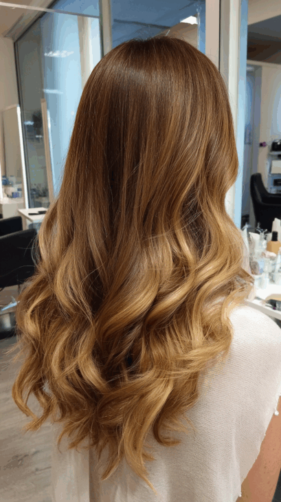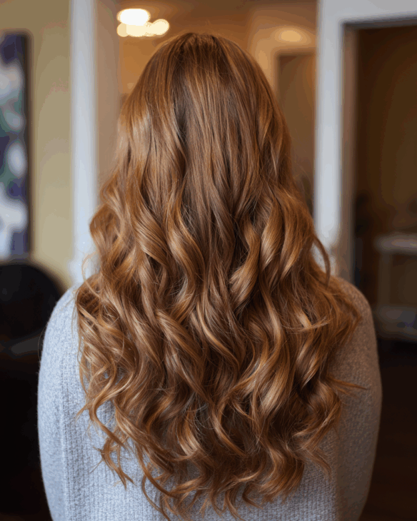 These soft waves show off everything golden brown does best: depth, light, and natural movement. The highlights are placed perfectly to enhance each curl and layer.