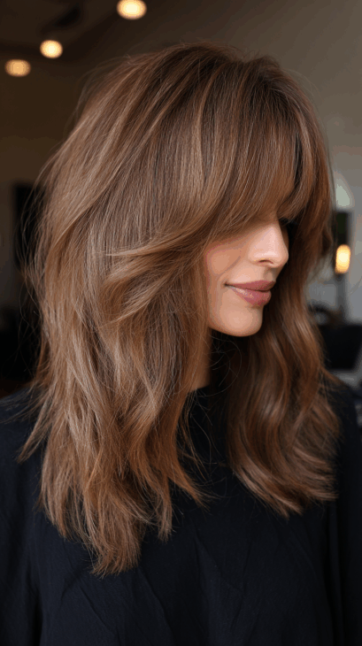 This golden brown tone paired with curtain bangs gives a perfect blend of trendy and timeless.
