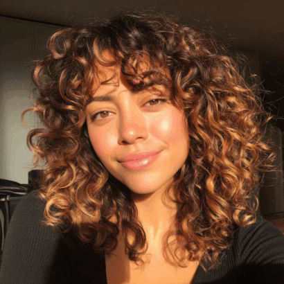 These curls are full of life and glow. The golden brown balayage enhances the shape of each curl, giving it definition and warmth.