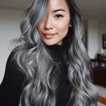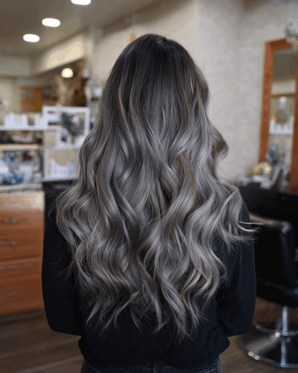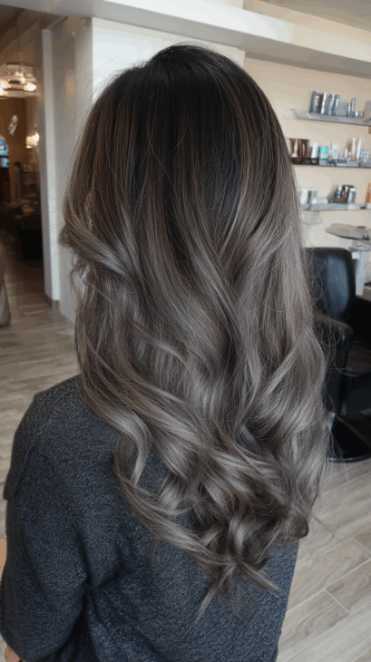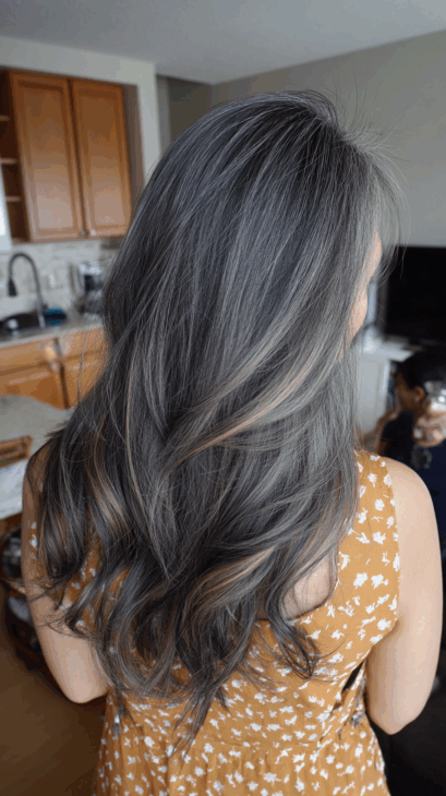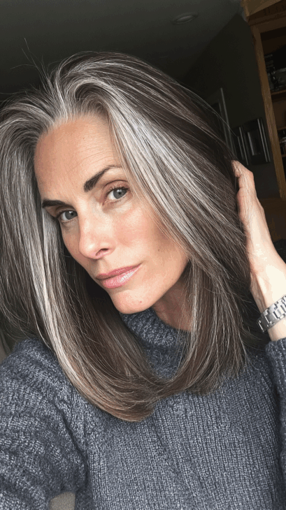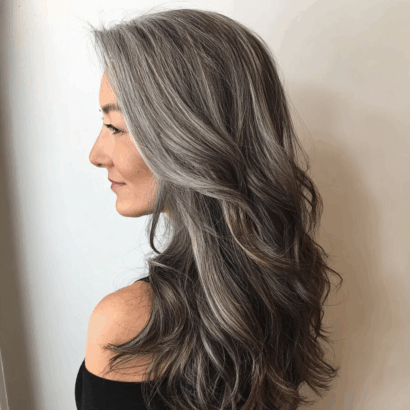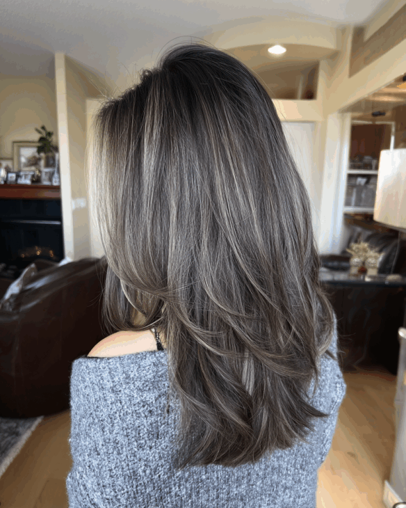 These long layers transition from deep brunette at the roots to cooler, silvery grey through the ends. It’s a perfect example of how grey doesn’t have to mean all-over silver.