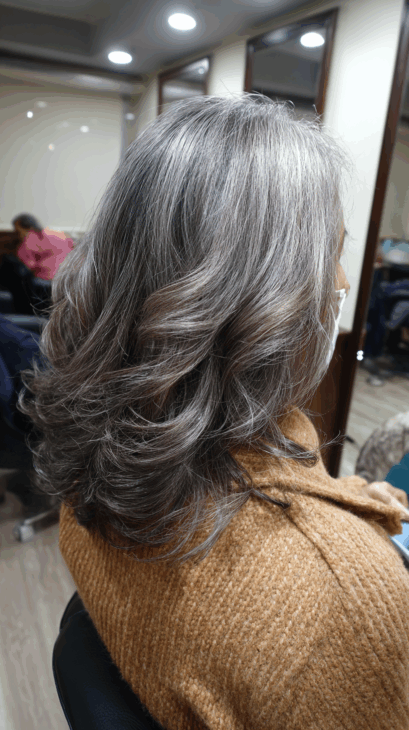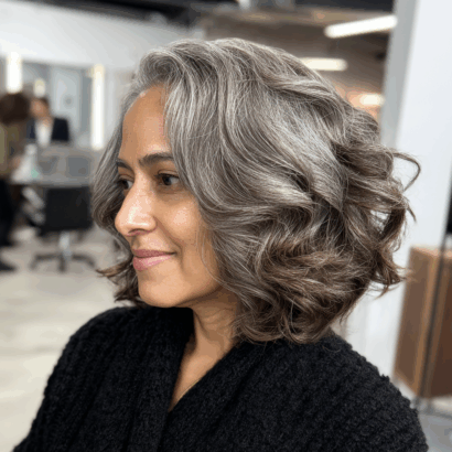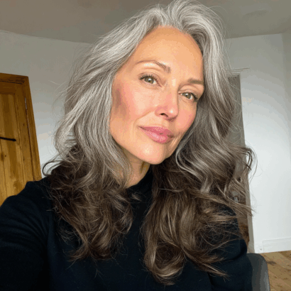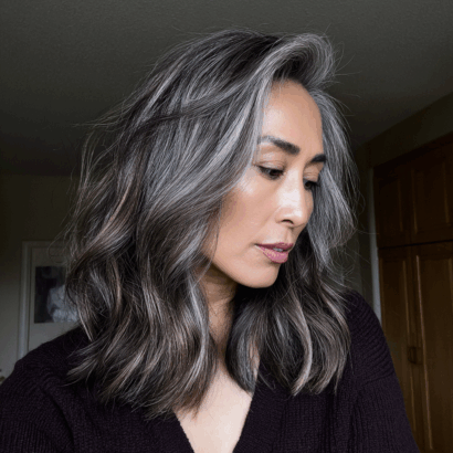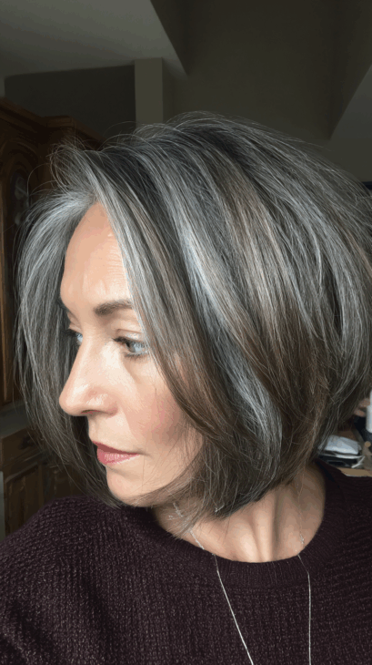 I like how this one still reads sophisticated but with a really wearable, everyday softness. It’s perfect if you’re growing into your greys and want a transitional look.