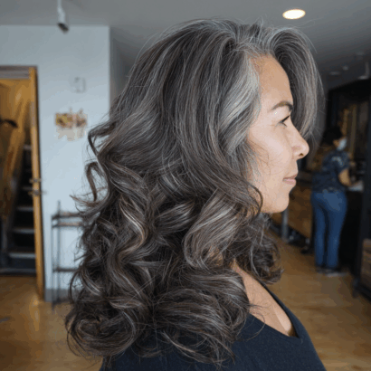 - Voluminous Curls with Subtle Grey-Infused Highlights