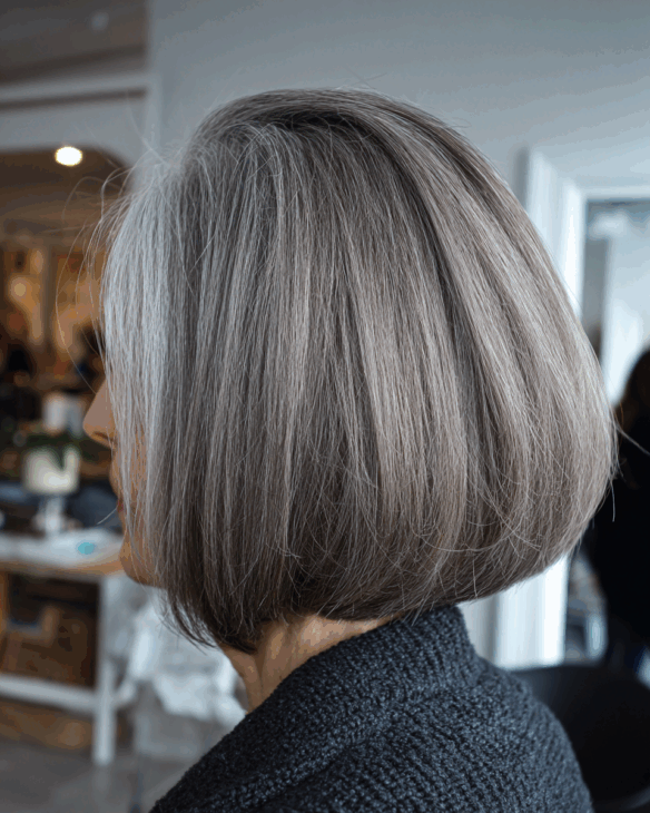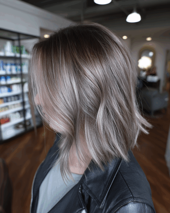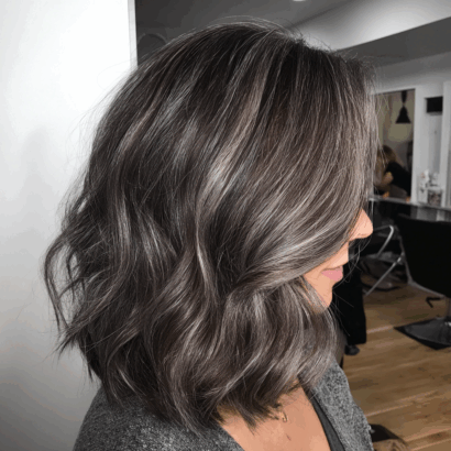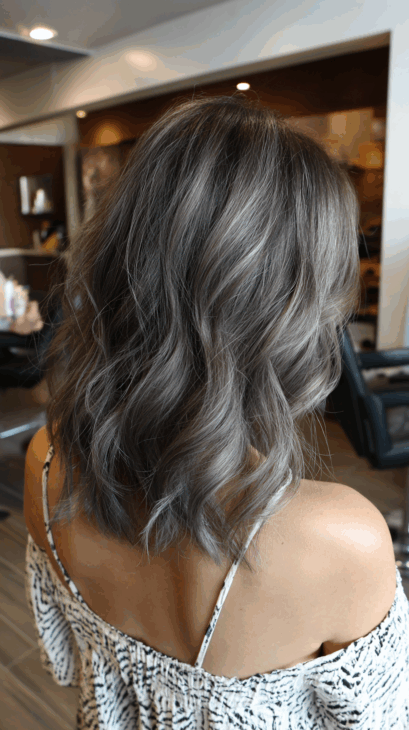 This shoulder-length lob has a beautiful soft wave pattern that really enhances the cool-toned grey. I love how the subtle brown undertones peek through the grey—it adds depth without stealing the show.