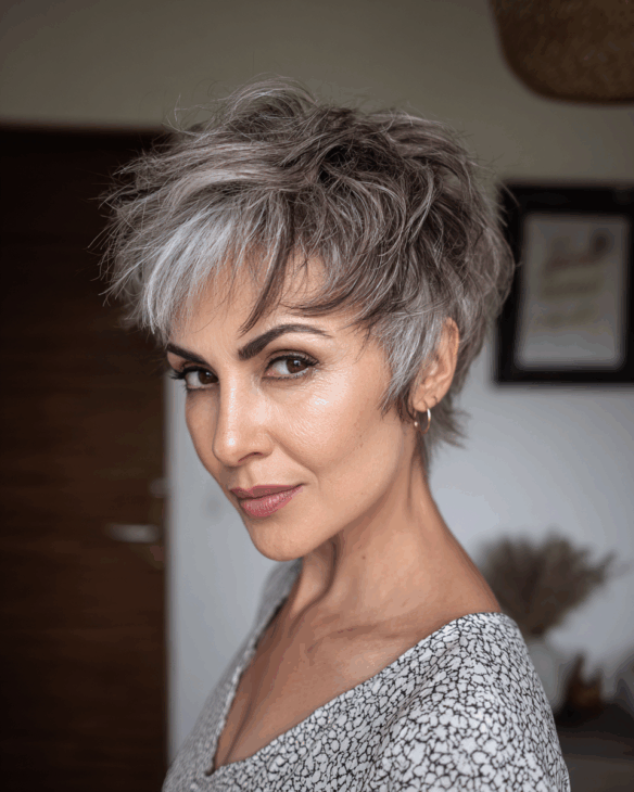 Edgy Pixie with Steel Grey and Chestnut Accents