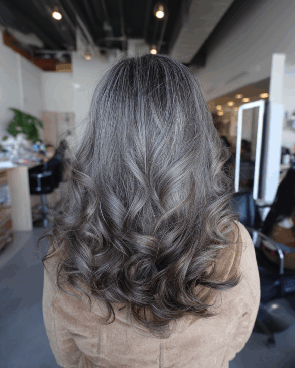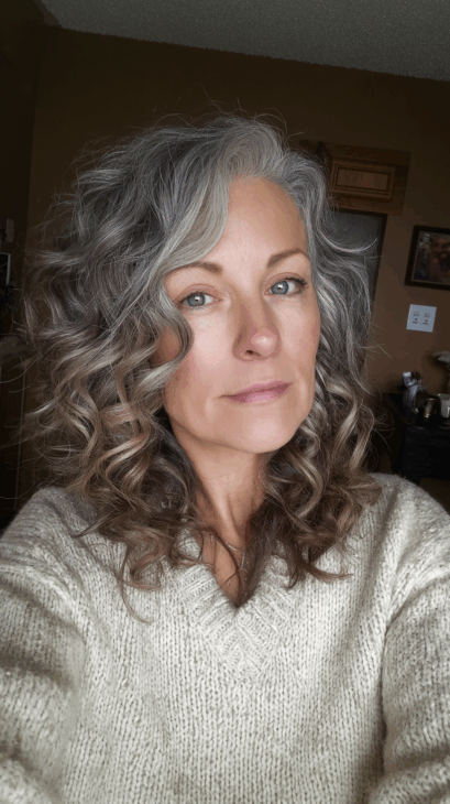 These big, bouncy curls are everything. The grey is blended with dark brown tones that create so much dimension and volume.