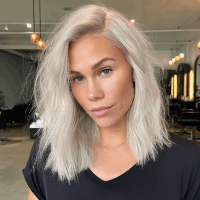Here we’ve got a lob styled with loose, tousled curls that make platinum blonde look lively and full.