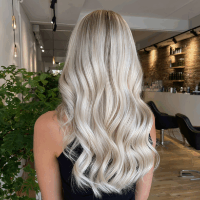 This style is all about that soft, cool-toned platinum blonde paired with loose waves. I love how the icy finish makes the hair look glossy and healthy while the texture keeps it modern and effortless.
