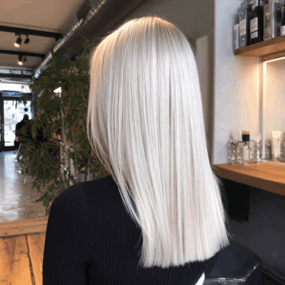 Here’s a straight, glass-like finish that makes platinum blonde look super high fashion.