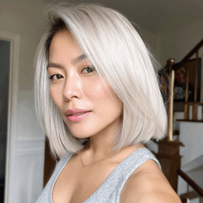 A layered bob in platinum blonde always has a fresh, youthful feel. I really like how the layering gives the hair body and movement, so it doesn’t fall flat.