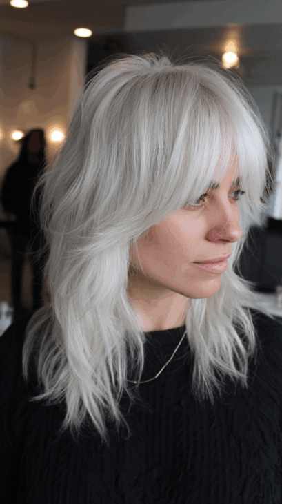 This cut combines a trendy shag with wispy bangs and bright platinum color. I love how the layers add movement and keep the platinum from feeling too heavy.