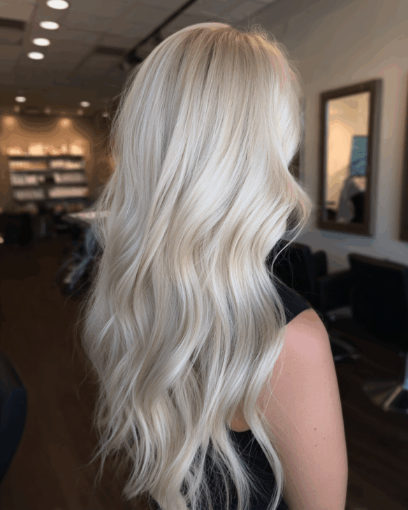 This look is all about that creamy platinum tone paired with soft, flowing waves. I love how the light catches on the bends, giving the hair so much dimension and shine.