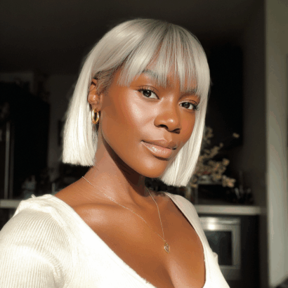 This sleek platinum bob with bangs is such a statement look. The bright icy tone pairs perfectly with the blunt shape, giving off a chic, high-fashion vibe.