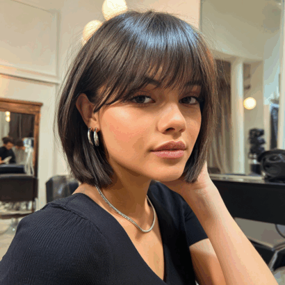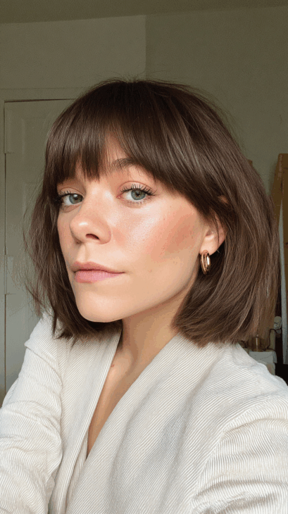 This textured brown bob with fringe has a relaxed yet refined look. The light layering gives it shape without losing that straight, smooth finish.