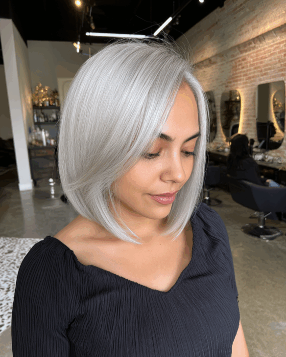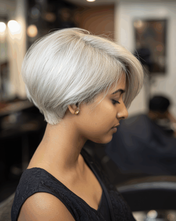 This silver asymmetrical pixie bob gives such a confident, edgy vibe. The longer side keeps it flattering while the shorter back adds volume and lift.