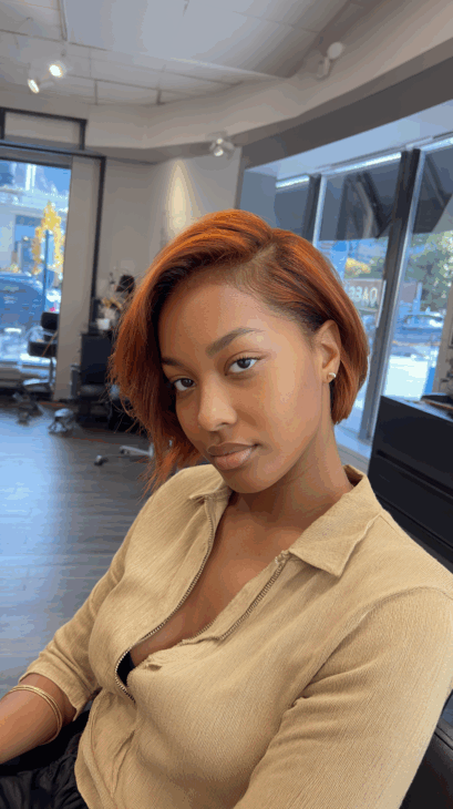 This copper precision bob is rich, shiny, and full of personality. The clean lines make it feel modern, while the warmth of the color adds softness.