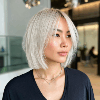 This icy blonde blunt bob is clean, crisp, and effortlessly cool. The precision of the cut makes straight hair look sharp and healthy.
