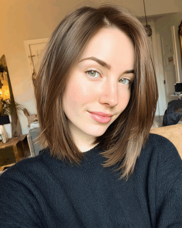 This soft brunette bob is the perfect in-between length for easy everyday styling. The slightly layered ends add natural movement while keeping the sleek shape intact.