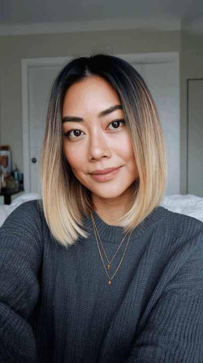 This blonde ombre bob blends darker roots into buttery blonde ends so beautifully. The straight finish makes the transition seamless and modern.