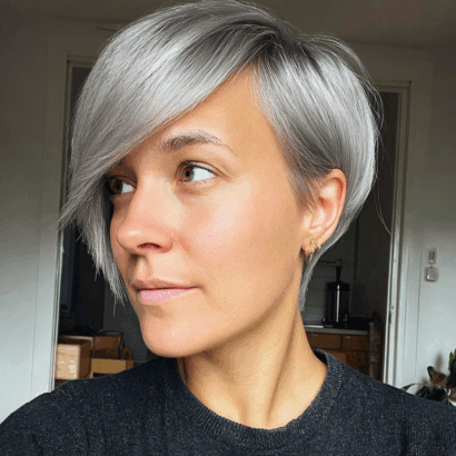 This silver asymmetrical pixie bob gives such a confident, edgy vibe. The longer side keeps it flattering while the shorter back adds volume and lift.