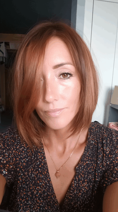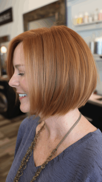 This copper precision bob is rich, shiny, and full of personality. The clean lines make it feel modern, while the warmth of the color adds softness.