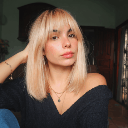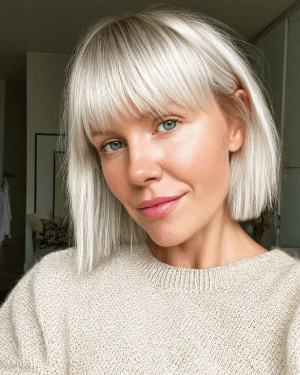 This sleek platinum bob with bangs is such a statement look. The bright icy tone pairs perfectly with the blunt shape, giving off a chic, high-fashion vibe.