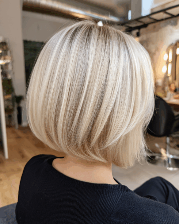 This icy blonde blunt bob is clean, crisp, and effortlessly cool. The precision of the cut makes straight hair look sharp and healthy.