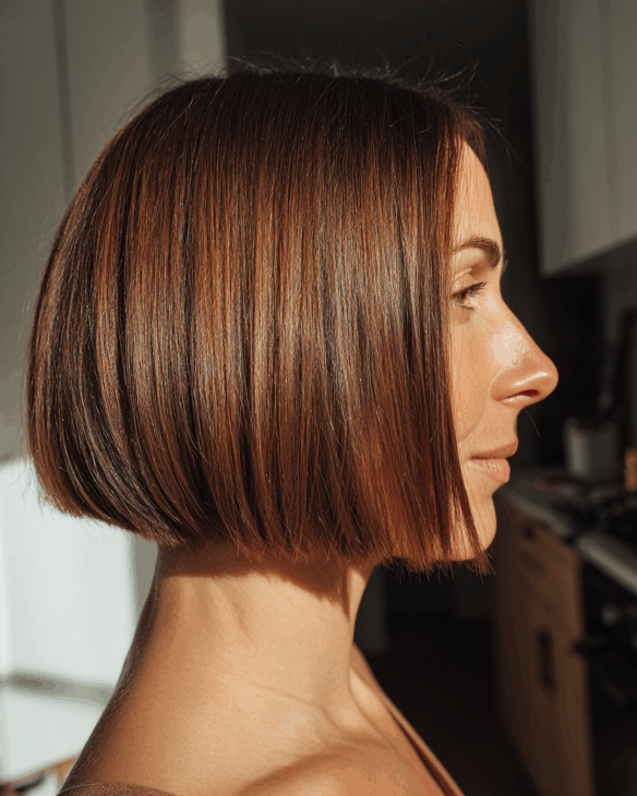 This warm auburn bob catches the light beautifully, adding a soft glow to the overall look.
