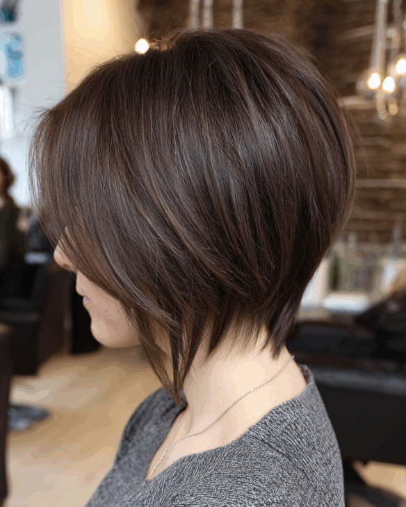 This honey brunette stacked bob is perfect for adding volume and movement to straight hair. The shorter back gives it a nice lift while the longer front layers elongate the face.