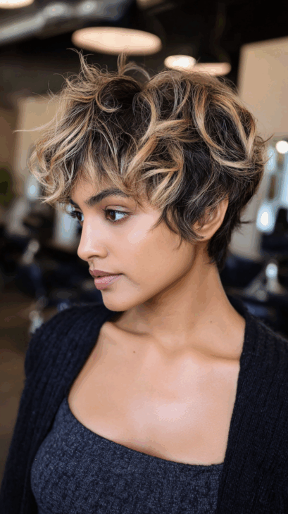 This textured pixie is perfect if you love volume and movement. The soft blonde highlights add brightness and really bring out the waves, making the cut feel effortless and lively.